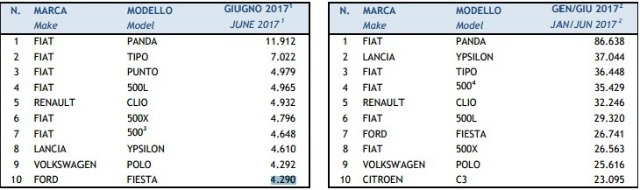 La Panda domina anche la classifica dei primi sei mesi del 2017. Con ben 86.638 unità, si stacca nettamente dalla seconda auto nella top ten: Lancia Ypsilon (37.044). Al terzo e quarto posto troviamo Fiat Tipo (36.488) e 500 (35.429). Al sesto e ottavo la versione Large del Cinquino (29.320) e la 500X (26.563).
