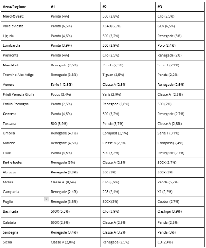 Così come nel comparto delle auto nuove, anche per quel che riguarda l’usato la Fiat Panda mantiene il record di auto più venduta in Italia, in tutte le regioni, con quote fino al 4-5%. Al secondo posto, un’altra Fiat, la 500 (al 3%); al terzo la Jeep Renegade (tra 2,5 e 3 %). Non stupisce dunque che Fiat sia il brand più acquistato a livello nazionale, con una quota al 13%. Seguono i tedeschi Volkswagen e Mercedes-Benz, entrambi al 7%.