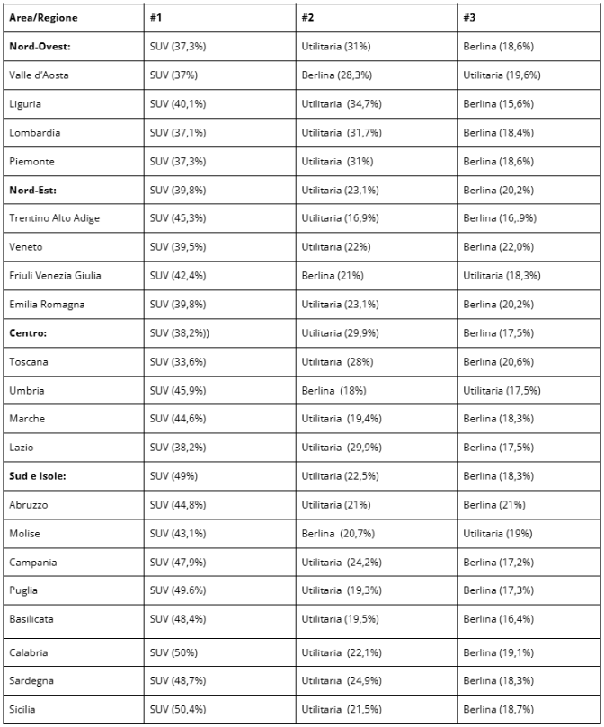 Per quel che riguarda i segmenti, il 2025 conferma la passione degli italiani per i suv, il segmento più venduto nel corso dell’anno, con una quota che raggiunge il 49% al Sud e nelle Isole e supera il 38% nel Centro e al Nord. Seguono le utilitarie, con una quota compresa tra il 22 e il 31% e le berline, stabili al 18-20%. Le motorizzazioni più ricercate restano quelle endotermiche, con la benzina a farla da padrone e il diesel in seconda posizione. Seppur l’ibrido raggiunga un terzo posto.