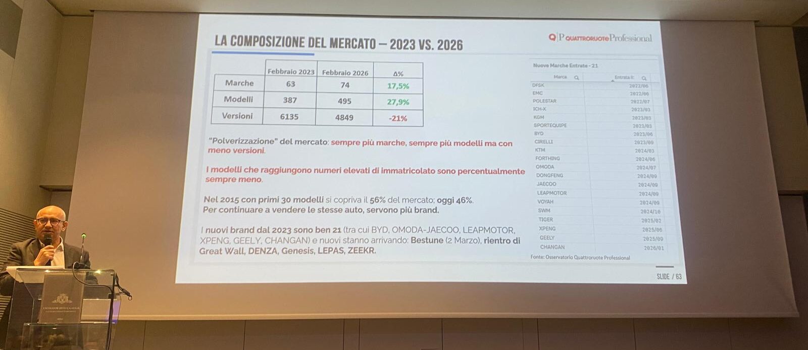 Nuovi attori di cui ha parlato Carlo Siviero, Data Factory and Market Analysis Director di Quattoruote Professional (foto sotto): “C’è una polverizzazione dell’offerta, con un +20% di brand +27% di modelli – ma meno 21% di versioni- in soli tre anni 23, passando da 63 a 74 Case sul mercato: con l’ultima cinese, per cui forse do uno scoop a qualcuno, che sarà a marzo la generalista Bestune. E siamo ancora a metà dell’ondata. La Cina produce più di quanto consuma, Tesla in in calo e fare un veicolo elettrico è più facile, con il meno 70% di componenti meccanici rispetto a un veicolo termico“.