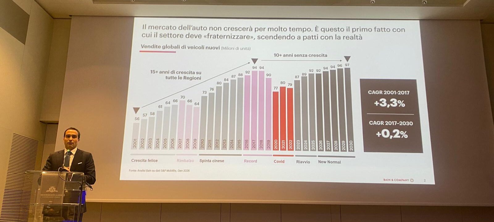 Gianluca Di Loreto, partner bain & Co (foto sotto), pur ribandendo la stasi del mercato italiano, allarga il discorso al Mercato Auto mondiale, anch’esso, come il nostro, “in crescita fino al Covid – del 3,3% di media all’anno – un mondo che oggi non esiste più. E non esisterà più neppure il 2030, con crescite risibili dello 0,2% annuo. Un mercato mondiale stabile, sui 95 milioni di immatricolazioni, che però vedo un cambio geografico epocale. Naturalmente con la spinta del colosso cinese. Ma vediamo il perché: i brand cinesi vendono soprattutto in Europa e in Sudamerica, con il mercato interno in calo, mentre non lo fa in Nordamerica. Dove vendono soprattutto giapponesi e coreani. Proprio il Nordamerica – Usa ma anche Canada e Messico – è il più grande importatore mondiale, con oltre 5 milioni, seguito dall’Europa, con 4 milioni, e la Cina con sole 800 mila vetture importate. Un tempo soprattutto tedesche”.