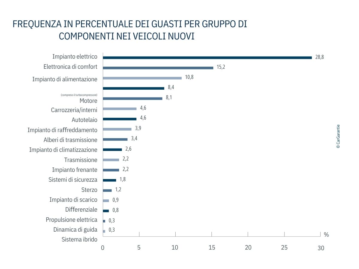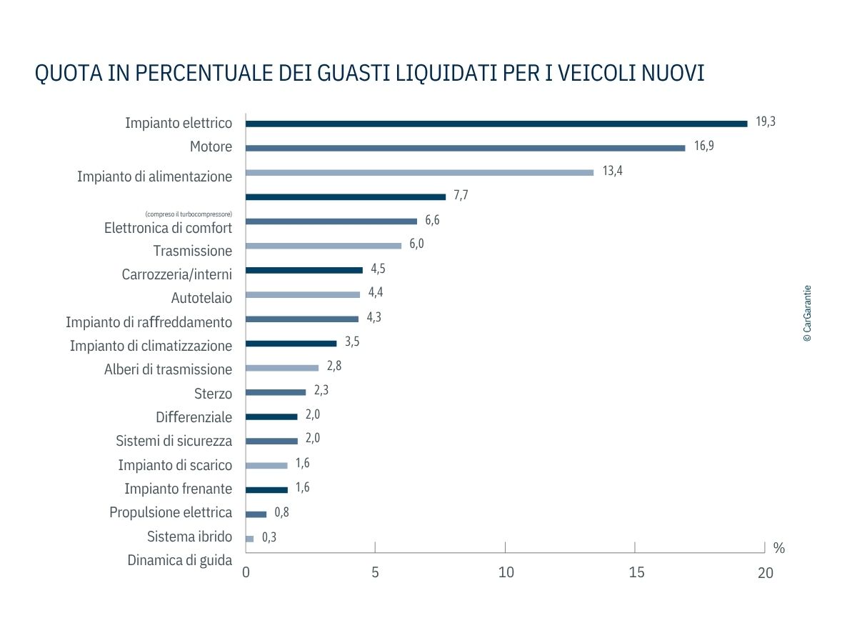 I dati GDV sono confermati dallo studio CarGarantie che, per determinare i costi medi di riparazione, ha analizzato circa un milione di contratti di garanzia scaduti su veicoli nuovi e usati. Per quel che riguarda le auto nuove, per la prima volta non è più il motore la componente dai costi di riparazione maggiori. A superarlo è il sistema elettrico, che raggiunge una quota del 19,3%. Il motore è al secondo posto con il 16,9%, seguito dal sistema di alimentazione che si attesta al 13,4%.
